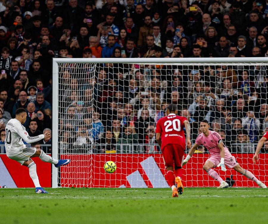 The breakthrough came in the 38th minute, when Bellingham rose highest to head home from a Rodrygo free-kick, giving the hosts a deserved lead after a controlled first-half display. Sevilla attempted to stay compact but struggled to create clear chances.